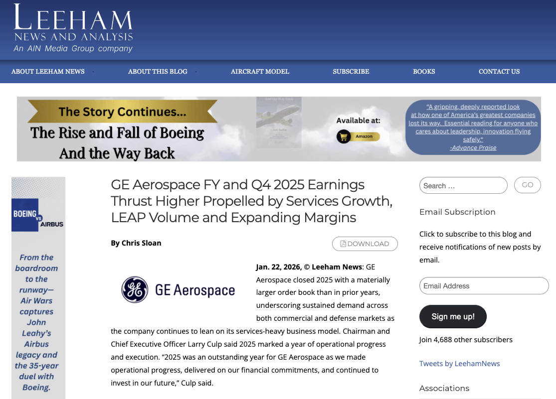 GE Aerospace FY and Q4 2025 Earnings Thrust Higher Propelled by Services Growth, LEAP Volume and Expanding Margins